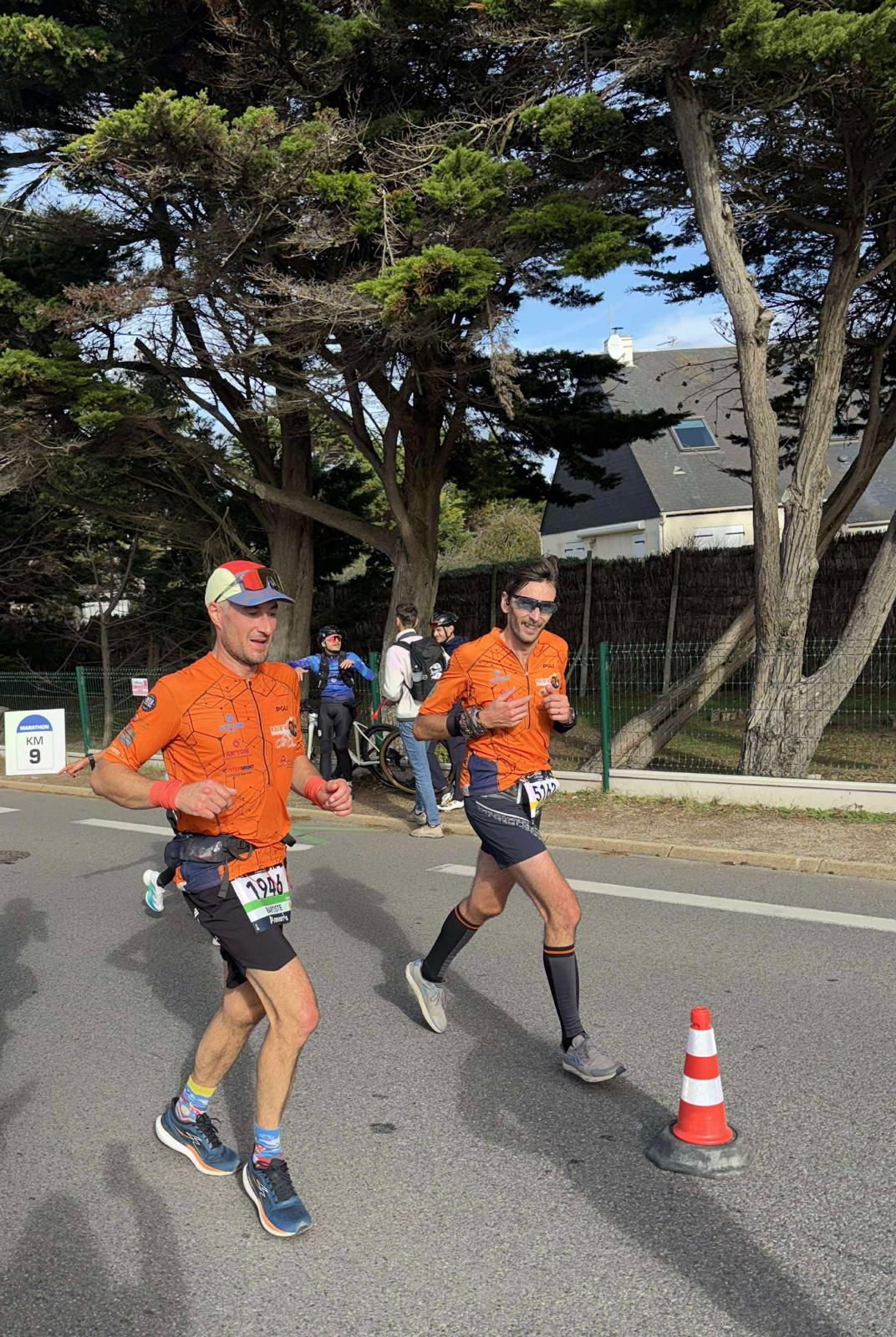 Le premier 10 km est plutôt urbain avec quelques trottoirs et signalisations à éviter, puis on entre dans les marais salants, il fait chaud mais ça déroule plutôt bien malgré un petit vent. Le semi est bouclé dans les temps en entrant dans le Croisic. On se rassure : jambes, cardio, allure… tout va bien !